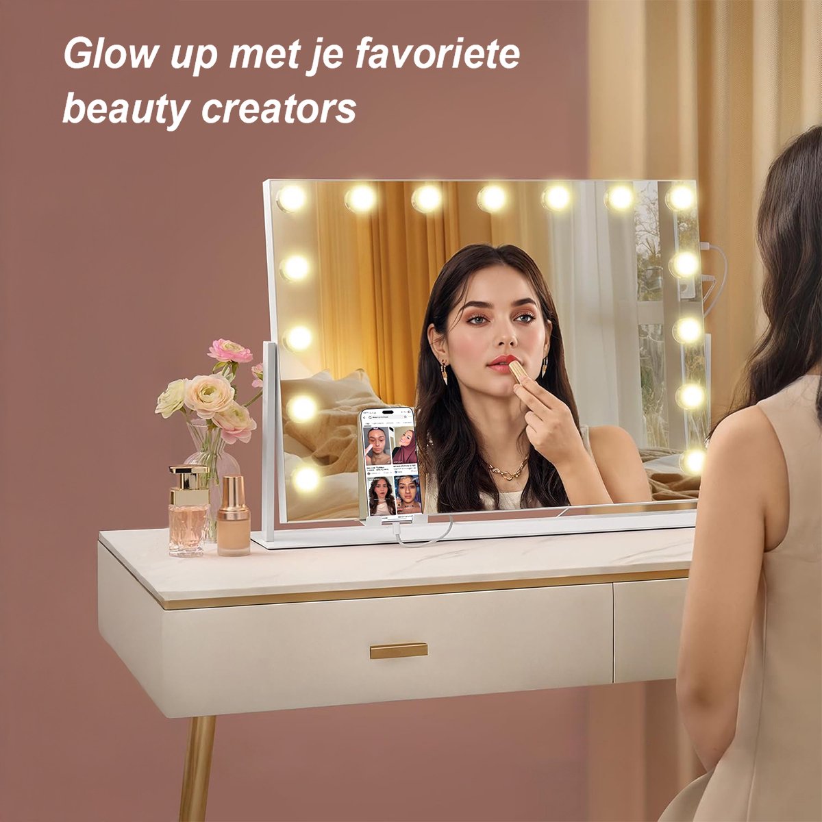 Ervaar luxueuze make-up routines met een glamoureuze spiegel die haarscherpe reflectie, dimbare verlichting en een elegant ontwerp combineert voor elke ruimte.