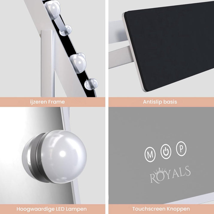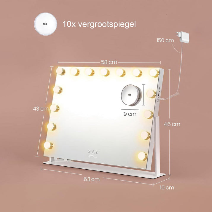 Royals Hollywood make up Spiegel - 63x46CM - Bluetooth - 360° Rotatie - 15x Led Lampen