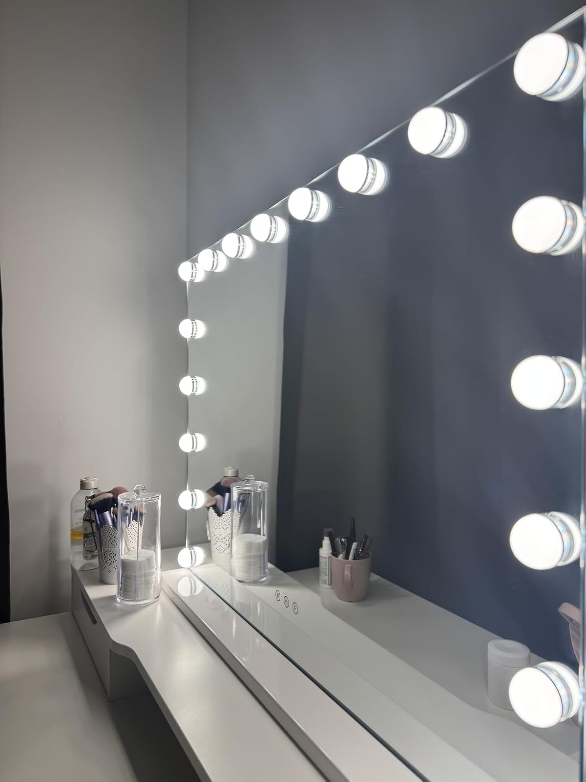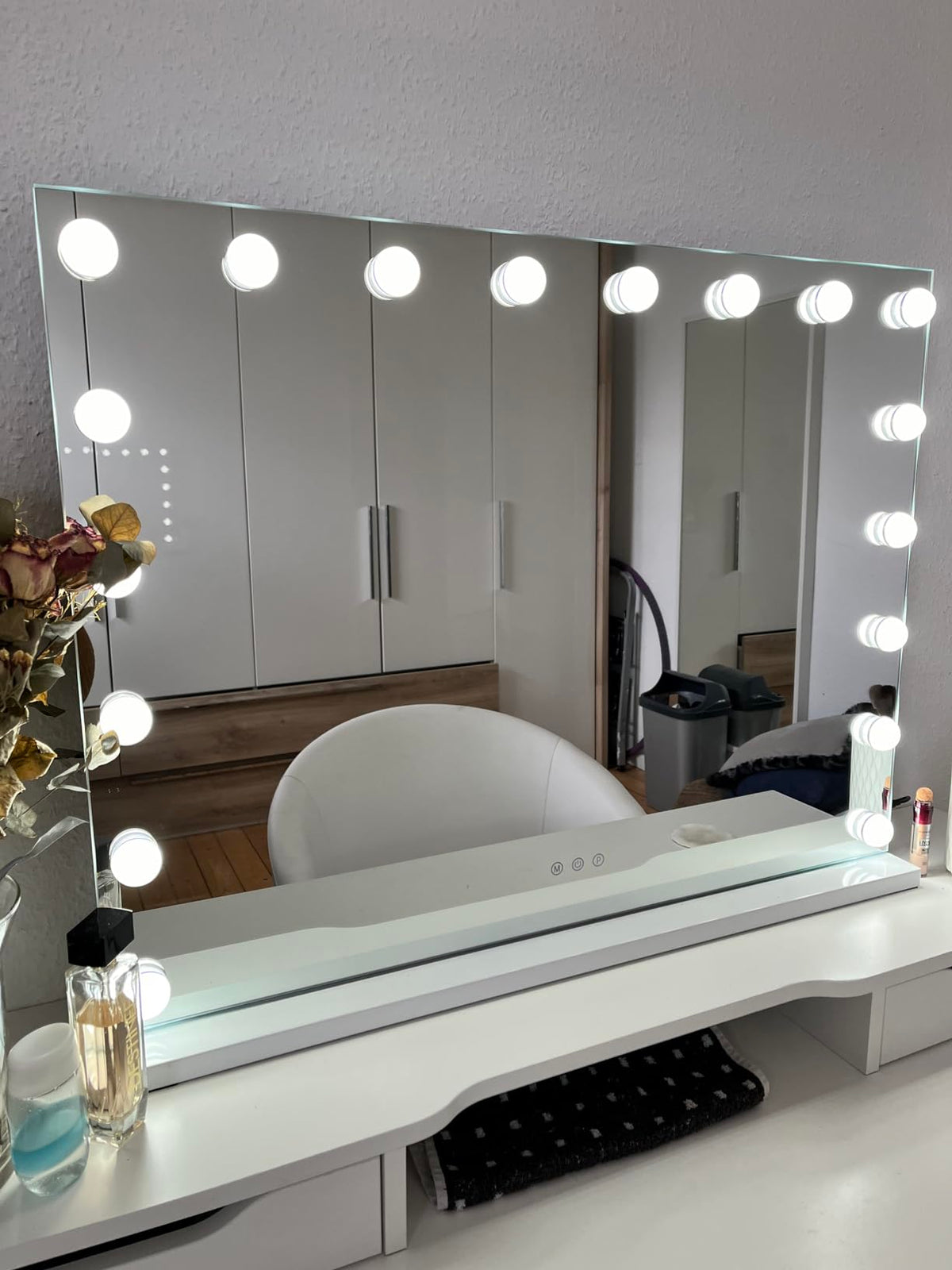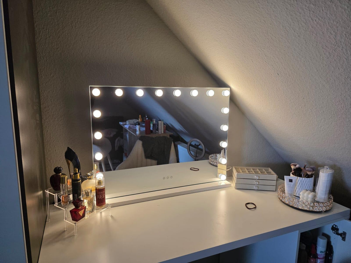 Ervaar luxueuze make-up routines met een glamoureuze spiegel die haarscherpe reflectie, dimbare verlichting en een elegant ontwerp combineert voor elke ruimte.